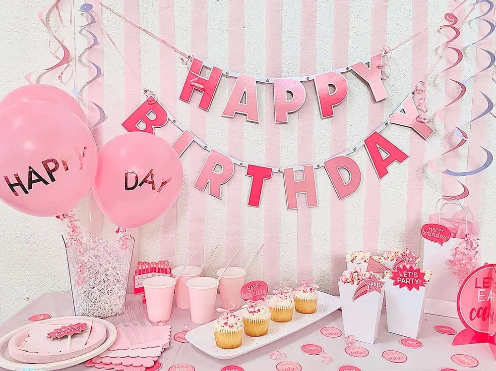 Pretty Blush Pink Birthday decorating is easy with Party City decorating kits and easy to find color themed products. I love these customizable balloons… they come with pretty rose gold stickers you can create with!