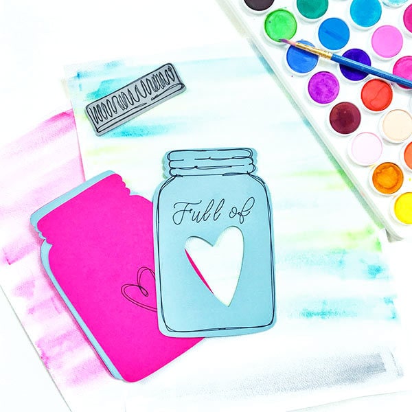 - Finally, cut another jar design, without drawing, from your second watercolored cardstock. I used a pink watercolored piece for this… it is the back piece, without the heart cut out and is the color the heart will display.