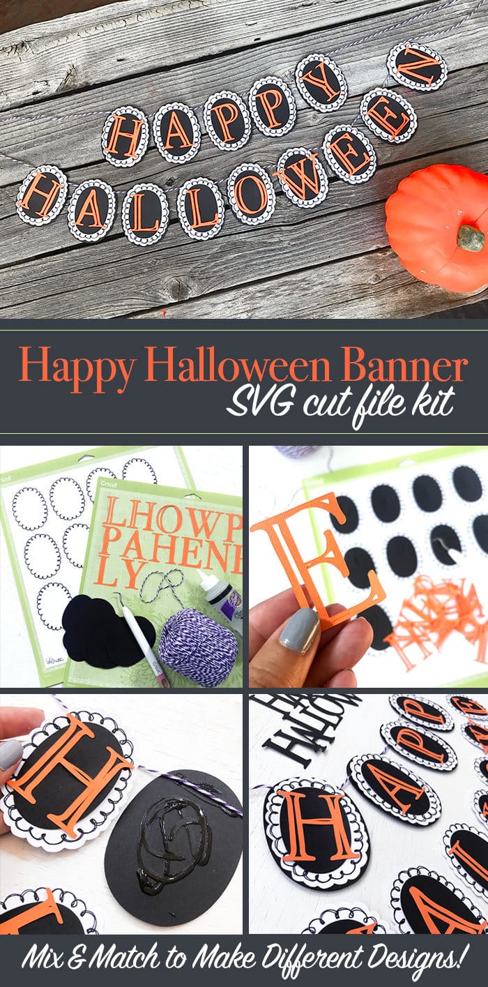 You can layer different cutouts, include the drawing design, or leave it out. You can pick and choose what colors you like best or just use the letters included. Here's how to make this Happy Halloween Banner.