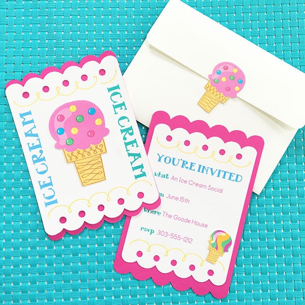 - Glue the small ice cream cone on to accent the lower right of the party info side of the invitation.