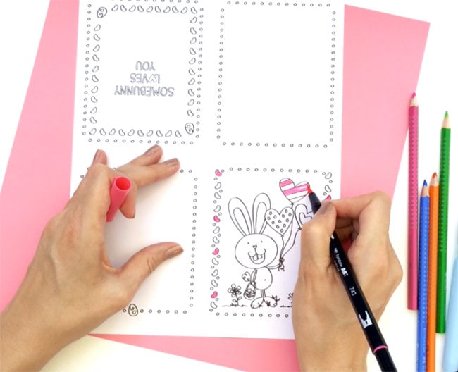 Grab your favorite coloring supplies and color your own cute Easter Card Coloring Page. This illustrated printable is the perfect little note to send to your somebunny special. The full page prints with a layout ready to fold and give as a card. Inside message is Somebunny Loves You.