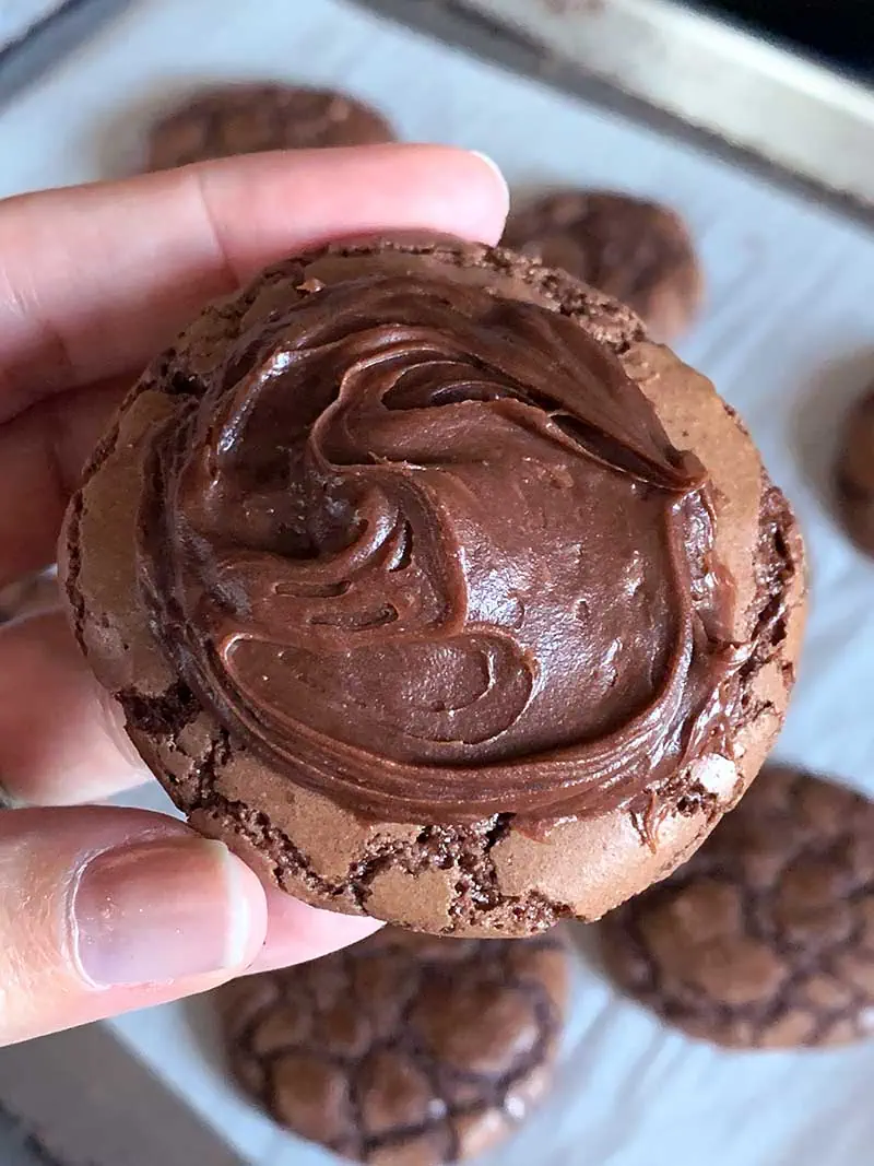 - Let the cookies cool to the touch and then add the frosting with the back of a spoon to get the nice swirl look.