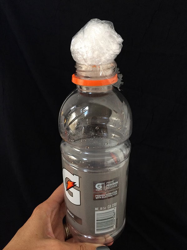 - Carefully remove the napkin from the parchment paper and drape over the plastic bottle. Some of the napkin will overlap and stick to itself. Carefully adjust the draping until it looks how you would like.