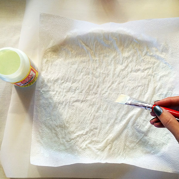 - Using the paintbrush, coat the napkin with Mod Podge Glow-in-the-Dark. If you work from the center, out, the coating will appear to fade out at the end of your ghost. The center of the napkin will become the head of your ghost. Do not over-coat napkin, however do coat well so you have a good glow effect. Do not allow to dry between coats as you need to jump to step 4 before the Mod Podge dries.