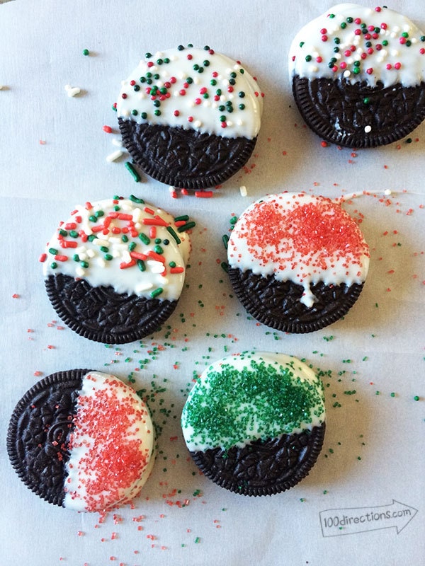 These are the easiest I think because you don't even have to really worry about how you're dipping. Just follow the instructions on the melted chocolate package to melt your chocolate and then dip half the cookie in the chocolate. Set the cookie down on parchment paper, sprinkle with your Christmas sprinkles and let it dry.