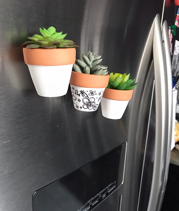 I added little magnets with hot glue to the back of my mini pots. They can be used as decor on the fridge or, I have some magnets set up on my wall next to my desk, so adding a little plant is perfect for including some color to my small workspace decor. You don't need to attach magnets to your own pots, but I think it's a fun idea to create an extra mini decor accent for your space.