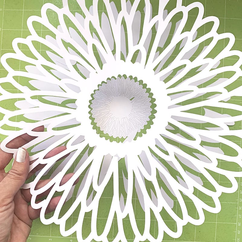 - Place the large cut flower under the plate, or on top of placement if you're using one. For extra color, you can add a piece of 12×12″ paper under the flower cut out.