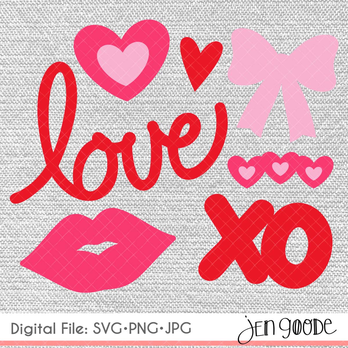 This Valentine's Day icon set includes hand-drawn designs in red and pink — a scripty “love” word art, layered hearts, a cute bow, kiss lips, a heart border, and bold “XO” lettering. Available as SVG, PNG, and JPG digital files. Perfect for cards, shirts, tote bags, or whatever Valentine project you've got going on. Cut them with your electronic cutting machine, or use the PNG files for print projects. Mix and match the individual elements to make something that's totally your own.