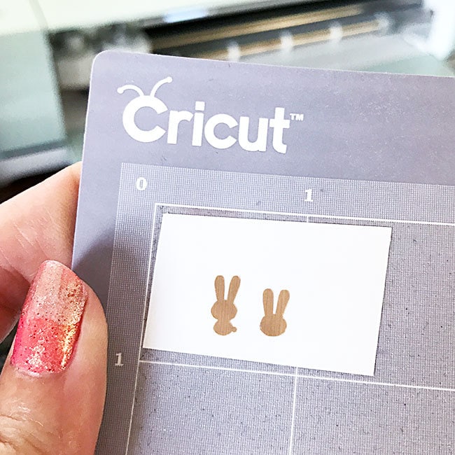 - Upload the Easter icons SVG to Cricut Design Space. Hide all the icons except the bunny body. Shrink the bunny image to just under 1/4″ wide. Cut the image using the vinyl setting and gold adhesive foil.