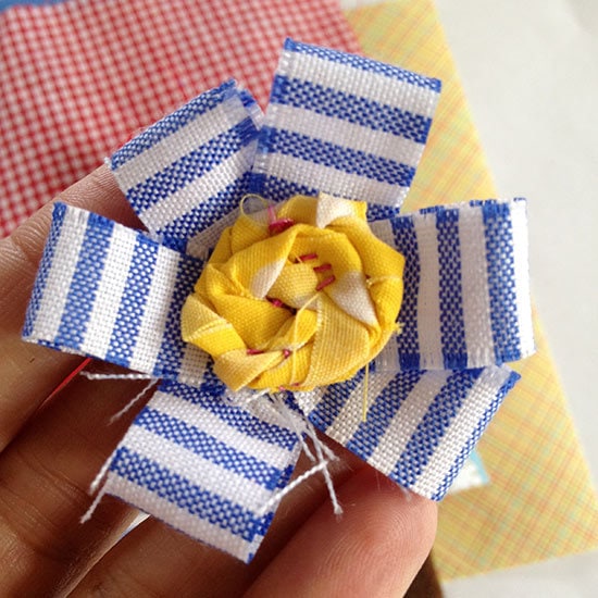 The patterns and colors coordinate beautifully – very “no brainer” combinations so I don't even have to think about this fabric pieces to use. I can just grab and go. I love that easy creativity – makes the gluing and glitter so much more fun! I grabbed a pile of fabric swatches and made a couple little flowers. Usually I'll glue the flowers together using a fabric glue, but I happened to have the needle and thread out, so I sewed these cuties.